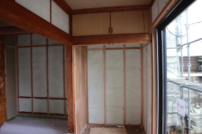 等間隔でない柱の間に、新たにグラスウール素材の断熱材を敷き詰めるには時間と手間と費用がかかります。その為今回壁と床下は、吹付断熱を提案させて頂きました。
