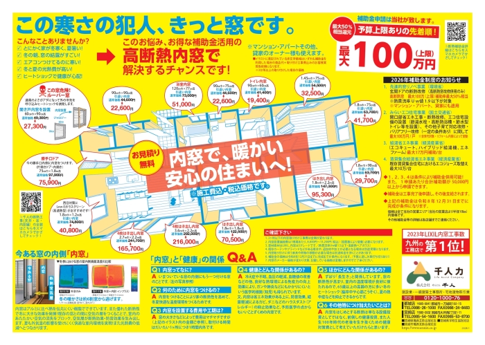 「窓だけでなく、床や給湯器も一緒にやった方がお得?」といった相談も含めて、今のうちから千人力へ相談ください。
