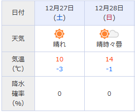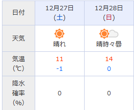 天気予報によると、特に12月27日(土)の朝は気温が大幅に下がる見込みです。