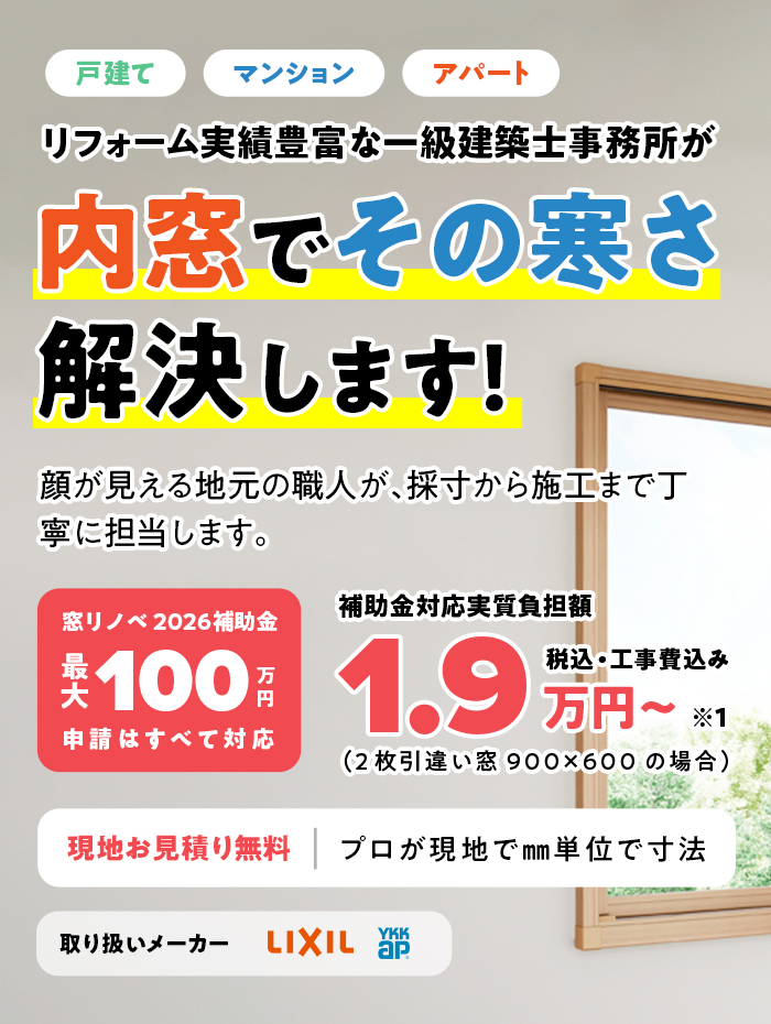 まず、被害の根本原因である腐食した土台を徹底的に補修し、築60年のお住まいの構造強度を回復させ注入材を実施。この「安心」を確保した上で、次のステップとして「内窓」による断熱リフォームをご提案。古い家が持つ最大の弱点である窓の断熱性を補い、冬の寒さや夏の暑さを大幅に改善します。国の補助金も活用できるため、費用を抑えて高い効果が期待できます。